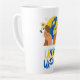 Modern hand drawn latte mug design showing global support for the people of Ukraine features multiple hands holding a globe in colours of Ukraine flag with "Unite for Ukraine" text