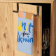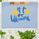 Artistic kitchen towel design showing global support for the people of Ukraine features multiple hands holding a globe in colours of Ukraine flag with "Unite for Ukraine" text