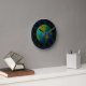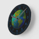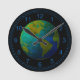 This graphic of a globe is in blues and greens and set against a black background. The clock face is in the same blue as the water of the globe.