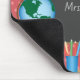 This teacher mouse pad features a graphic of a teacher's desk accented with a globe, books, apples and pencils. A chalkboard appears on a salmon and pink polka dot background and offers custom text for the teacher's name.