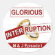 The Glorious Interruption: A Golden Beginning image features a clean, white background. It includes several text elements and a central graphic, creating a minimalist yet impactful composition. At the top, the word "GLORIOUS" is enclosed in a thin red rectangular border. The word "INTERRUPTION" is placed diagonally across the centre, also framed by a red border, overlapping a graphic of two golden rings. Below the rings, the text "M & J Episode I" is similarly bordered in red, adding to the overall design.
