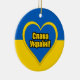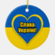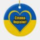Ceramic ornament with the flag of Ukraine, heart in the Ukrainian colours, and text saying "Glory to Ukraine" in Ukrainian