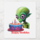 This is a funny image of a birthday celebration of aa alien, complete with a cake and candles.