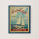 This Greetings From Gloucester Massachusetts vintage travel nautical design features a boat sailing on the water with seagulls and a blue sky filled with gorgeous puffy white clouds.