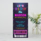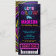 Celebrate your birthday party with our Neon Glow ticket invitation. Ticket pass Features futuristic let's glow text on dark background. This trendy design is perfect for roller disco or glow party.