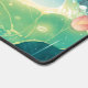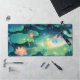 Illuminate your desk with this magical, whimsical illustration featuring a tiny, cheerful blue axolotl with adorable pink-tipped gills. The little creature is comfortably settled in a spot of glowing yellow light on a dark, deep blue pond. The scene captures a rainy night, with glistening raindrops streaking down and splashing across the surface of immense luminous green lily pads. Beautiful pink and orange lotus flowers float alongside the axolotl, enhancing the dreamy aquatic night theme. This enchanting design brings a unique, serene, and fantastical atmosphere to any workspace. This desk mat offers versatile use for various other businesses, events, or situations.