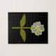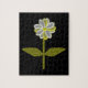This awesome puzzle features a digital image of a daisy with a green stem with two green leaves on it and white and yellow coloured petals with a yellow centre. The petals look like they are glowing with a beautiful reflective quality. The flower is on a black background for maximum contrast and the result is stunning.
