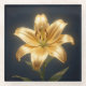 Golden lily flower in full bloom, luminous metallic gold petals with soft gradient highlights. Delicate natural detailing, dark moody background for dramatic contrast.