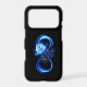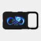 Luminous infinity symbol with glowing, beautiful, lushly blooming rose made of blue flames on black background.