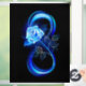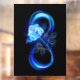 Luminous infinity symbol with glowing, beautiful, lushly blooming rose made of blue flames on black background.
