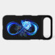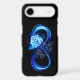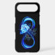 Luminous infinity symbol with glowing, beautiful, lushly blooming rose made of blue flames on black background.