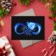 Luminous infinity symbol with glowing, beautiful, lushly blooming rose made of blue flames on black background.
