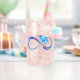 Luminous infinity symbol with glowing, beautiful, lushly blooming rose made of blue flames on black background.