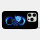 Luminous infinity symbol with glowing, beautiful, lushly blooming rose made of blue flames on black background.