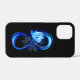 Luminous infinity symbol with glowing, beautiful, lushly blooming rose made of blue flames on black background.