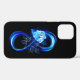 Luminous infinity symbol with glowing, beautiful, lushly blooming rose made of blue flames on black background.