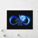 Luminous infinity symbol with glowing, beautiful, lushly blooming rose made of blue flames on black background.