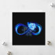 Luminous infinity symbol with glowing, beautiful, lushly blooming rose made of blue flames on black background.
