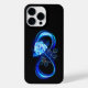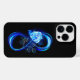Luminous infinity symbol with glowing, beautiful, lushly blooming rose made of blue flames on black background.