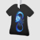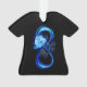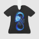 Luminous infinity symbol with glowing, beautiful, lushly blooming rose made of blue flames on black background.