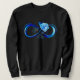 Luminous infinity symbol with glowing, beautiful, lushly blooming rose made of blue flames on black background.