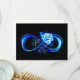 Luminous infinity symbol with glowing, beautiful, lushly blooming rose made of blue flames on black background.