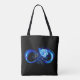Luminous infinity symbol with glowing, beautiful, lushly blooming rose made of blue flames on black background.