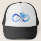 Luminous infinity symbol with glowing, beautiful, lushly blooming rose made of blue flames on black background.