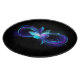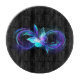 Infinity symbol with magical, purple glowing butterfly with transparent wings, on black background. Glowing butterfly.