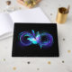 Infinity symbol with magical, purple glowing butterfly with transparent wings, on black background. Glowing butterfly.