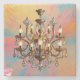 This striking image showcases an iconic chandelier, its intricate crystals and radiant lights meticulously detailed in fine lines. Bathed in golden hues, the chandelier embodies luxury and sophistication, creating a mesmerising interplay of light and shadow against a soft, light-coloured background.