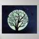 A spooky halloween themed graphic. A large full moon glowing brightly set behind an old dead craggy tree with crows sitting on its branches. Many birds flying around the deep blue star speckled sky.