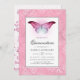 Quinceanera invitation featuring a maroon and pink butterfly and a grunge damask background with a lace reverse.