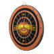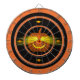 This design features an orange pumpkin that seems to be glowing in the dark. A candle lights up the eyes and a smile. A dark shadow is seen behind and to the sides of the pumpkin. A black backround with an orange border was added to the design. A great addition for anyone having a party. This dart board can be custom made with anyway you want.