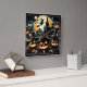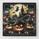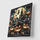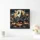 Three intricately carved pumpkins emit an eerie glow, surrounded by bats and a haunted castle backdrop under a full moon. Halloween magic is in the air.