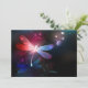 Glowing, flying, red dragonfly, with transparent, detailed wings on dark, nocturnal, luminous background with tropical plants and fireflies. Red dragonfly.