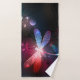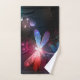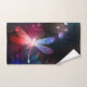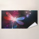 Glowing, flying, red dragonfly, with transparent, detailed wings on dark, nocturnal, luminous background with tropical plants and fireflies. Red dragonfly.