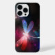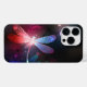 Glowing, flying, red dragonfly, with transparent, detailed wings on dark, nocturnal, luminous background with tropical plants and fireflies. Red dragonfly.