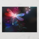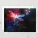 Glowing, flying, red dragonfly, with transparent, detailed wings on dark, nocturnal, luminous background with tropical plants and fireflies. Red dragonfly.