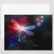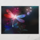 Glowing, flying, red dragonfly, with transparent, detailed wings on dark, nocturnal, luminous background with tropical plants and fireflies. Red dragonfly.