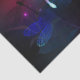 Glowing, flying, red dragonfly, with transparent, detailed wings on dark, nocturnal, luminous background with tropical plants and fireflies. Red dragonfly.
