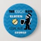 This Knight slays gluten: Celiac Alert button. Black and white knight with sword and shield. No gluten symbol is bright and easy to see to alert to restricted diet on bright blue chevron stripe background. Personalise with name. Great for kids at daycare or school as a reminder to caregivers of food restrictions. Designs by Lil Allergy Advocates www.lilallergyadvocates.com