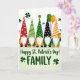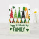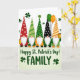 On the front of the card five cute gnomes stand shoulder to shoulder in a straight line, their fluffy white beards and round noses giving them a cosy, friendly look 💚. Each one wears a tall cone hat with a different pattern, including red polka dots, green stripes, orange-and-white chevrons, and a black hat dotted in white. Their close spacing and slightly tilted poses make them look like a little group photo, as if they’re leaning in for a shared laugh. Small shamrocks drift around them, and two balloons—one deep green and one bright orange—float nearby for a party touch ☘️. One gnome holds a tiny pot of gold while another carries a small golden pail, adding a sweet “we brought the treats” moment between friends. Beneath the gnomes, the message “Happy St. Patrick’s Day! FAMILY” sits centred in green lettering, easy to spot against the light background. Behind everything, the backdrop fades softly from white to pale green, keeping the focus on the characters and their patterned hats.