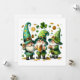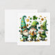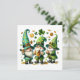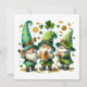 This cheerful holiday card captures the lively spirit of St. Patrick's Day with three jolly gnome-like characters, each dressed in festive green attire. They wear tall, pointed hats decorated with shamrocks and other playful elements. The gnome on the left and the gnome in the middle both hold frothy mugs of beer, while the gnome on the right claps joyfully. Scattered around them are classic St. Patrick's Day symbols, such as shamrocks, gold coins, and a large three-leaf clover at the top centre. The white background enhances the vibrant green colours and festive elements, making this card a delightful choice for spreading St. Patrick's Day cheer. 🍀