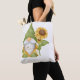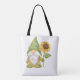 Gnome holding a sunflower and notes on a tote bag great for conversation while out shopping or just browsing around town