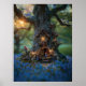 Cute Gnome house in a bark of tree surrounded by bluebells at sunset.