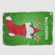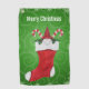 This golf towel is green with swirls bordered with white snowflakes and a red and white Christmas stocking that has a cute gnome in the top between candy canes and green holly leaves with red berries. Customise the Merry Christmas text with the template.