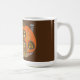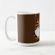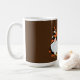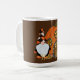Whimsical Autumn themed mug features watercolor pumpkin house illustration with adorable gnome in harlequin print outfit on medium brown background. Customisable text in modern handwritten style white font