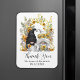 Custom wedding thank you magnet favours for your guests, featuring a bride and groom gnomes and a sunflower floral arch illustration. Edit the template with a date and the newlyweds' names.
