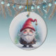 Unique Gnome Ceramic Ornament featuring a brown wooden frame and a scene of Christmas trees with a snowy winter wonderland in the background, capturing the Xmas magic and joy of the festive season. Whimsical cartoon character illustration graphic decor with wintry white snow landscape. Cute Gonk lover gift!